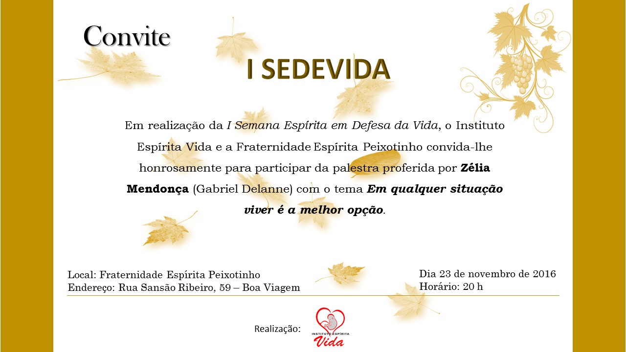 1ª Semana Espírita em Defesa da Vida – Palestra no dia 23/11/2016 – Convite